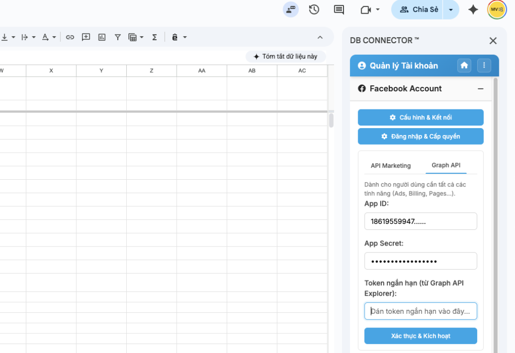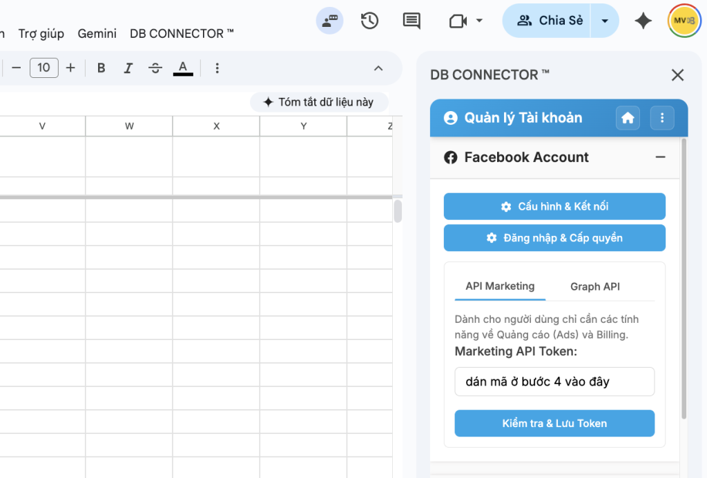 5- Quay lại Sheet DB Connector và paste vào phần TÀI KHOẢN > FACEBOOK > MARKETING API (như hình) và lưu