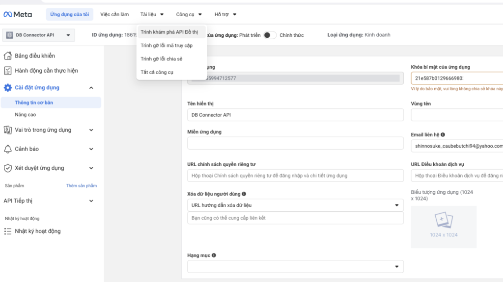 Tại phần CÀI ĐẶT ỨNG DỤNG chọn Thông tin cơ bản => copy ID ứng dụng + hiển thị và copy Secret sang phần mềm DB Connector