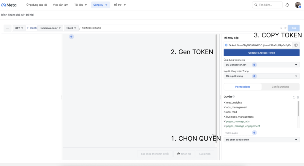 Được tạo ra để phục vụ cho việc test API Call nên Graph API có nhiều quyền hơn, đồng thời người dùng có thể CHỌN quyền mà mình cần truy cập dữ liệu. Trong phạm vi sử dụng dữ liệu – tải data về phần mềm DB Connector, các quyền cần cấp khi chọn Permissions cần chọn như sau: