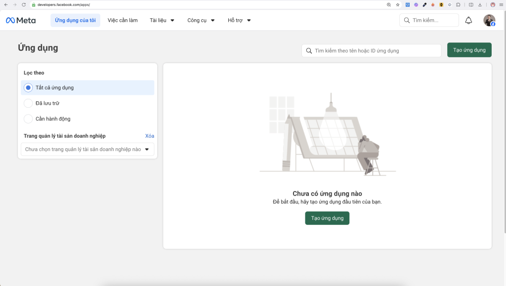 Sau khi tạo tài khoản nhà phát triển sẽ chuyển tới màn hình chính của https://developers.facebook.com/apps/