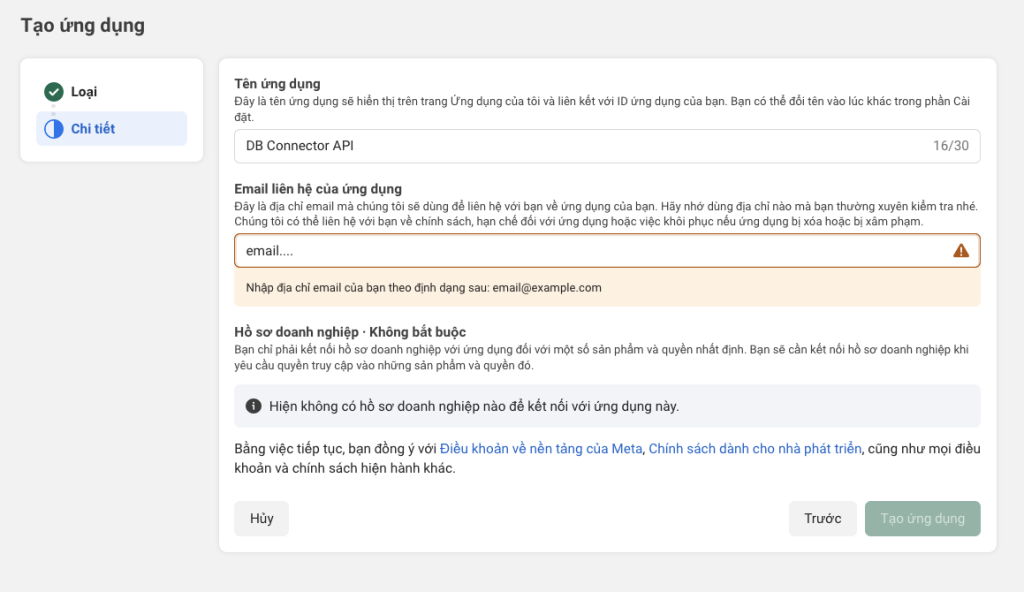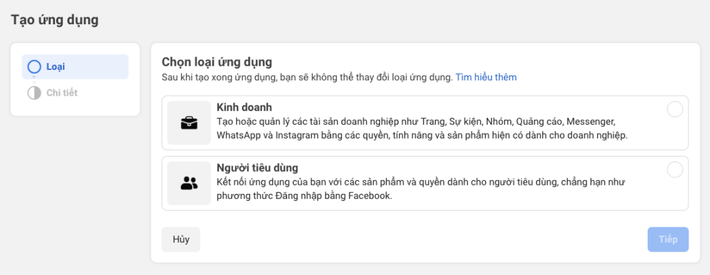 Tiếp tục (chọn tài khoản BM nếu cần); hoặc BỎ QUA và click TẠO ỨNG DỤNG