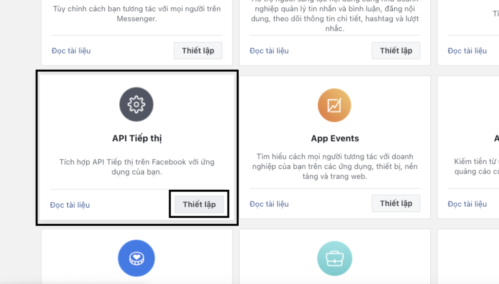 Để kết nối Marketing API, tại màn hình ứng dụng chọn API TIẾP THỊ => Thiết lập